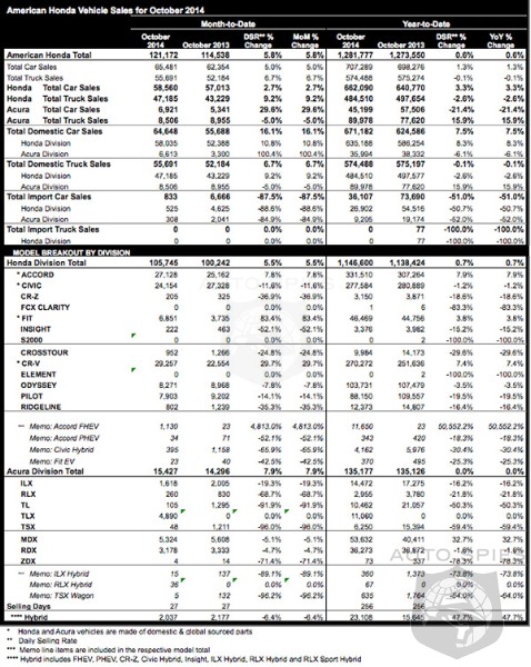 American Honda Motor Co., Inc. today reported total October 2014 Honda and Acura vehicle sales of 121,172 units, an increase of 5.8 percent versus October of last year. The Honda division set a new October record on sales of 105,745 vehicles, an increase of 5.5 percent for the month. The Acura division posted sales of 15,427 units to rise 7.9 percent in the same period.