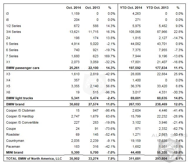 The BMW Group in the U.S. (BMW and MINI combined) reported October sales of 35,902 vehicles, an increase of 7.9 percent from the 33,274 vehicles sold in the same month a year ago. Year-to-date, the BMW Group (BMW and MINI combined) is up 6.1 percent on sales of 311,681 in the first ten months of 2014 compared to 293,804 in the same period in 2013.