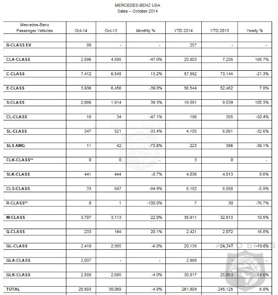 Mercedes-Benz today reported its highest sales month of the year with 28,593 vehicles sold. Despite marginally lagging behind October 2013 (which was fueled by the launch of the company's new entry-level CLA) by 4.9%, the month's volume propelled the company to the highest October year-to-date sales in its history with 261,804 units, an increase of 6.8% from the 245,125 vehicles sold through the first 10 months of 2013. Adding retails of 19,925 for Sprinter Vans and 8,665 units at smart, up 17.4% and 16.3% respectively, year-to-date volumes for Mercedes-Benz USA (MBUSA) hit a record 290,394, up 7.7%."We're building momentum month after month, working toward a record year despite the challenges posed by spot shortages in some of our most popular model lines," said Stephen Cannon, president and CEO of MBUSA.