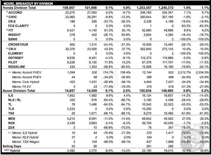 Four core vehicles in the Honda lineup contributed to a best-ever November for the brand. The newly redesigned CR-V led the Honda division's record month, posting its best November sales ever while Pilot showed fresh strength with a double-digit increase; the two vehicles boosted Honda Trucks to a new November record. The Honda Fit also set a new November mark.