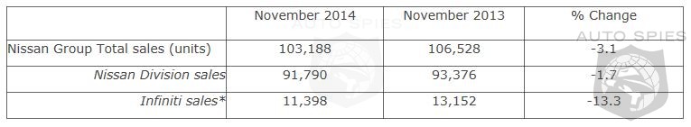 NOTE: To ensure consistency in global sales reporting, Nissan calculates monthly variances on a straight-percentage basis, unadjusted for the number of selling days. November 2014 had 25 selling days, while November 2013 had 26 selling days.