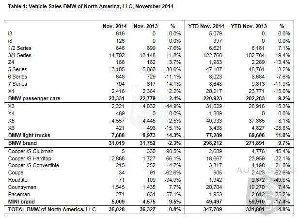 The BMW Group in the U.S. (BMW and MINI combined) reported November sales of 36,028 vehicles, a decrease of 0.8 percent from the 36,327 vehicles sold in the same month a year ago. Year-to-date, the BMW Group (BMW and MINI combined) is up 4.8 percent on sales of 347,709 in the first eleven months of 2014 compared to 331,801 in the same period of 2013.