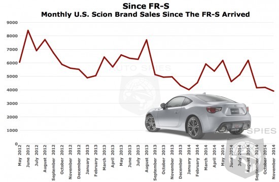 For the 18th consecutive month, the Scion brand’s U.S. volume declined in November 2014. The streak has reached a special low point, however, with the worst percentage decline since June and the lowest sales total since January 2012, when the iQ had only just arrived and the FR-S wasn’t yet on sale.
