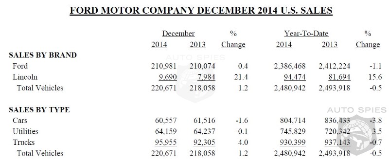 Ford Motor Company’s U.S. sales totaled 2,480,942 vehicles in 2014, flat versus a year ago, primarily due to the all-new F-150 changeover and a planned 15 percent reduction in daily rental sales.