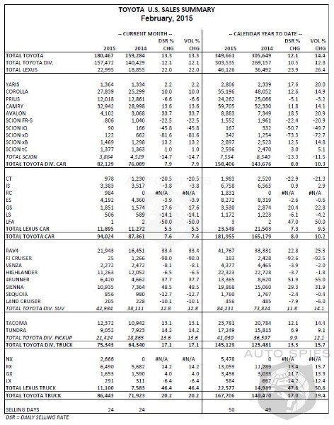 Toyota Motor Sales (TMS), U.S.A., Inc., today reported February 2015 sales of 180,467, an increase of 13.3 percent from February 2014 on a volume basis. With the same amount of selling days in February 2015 and 2014, sales were up 13.3 percent on a daily selling rate (DSR) basis.