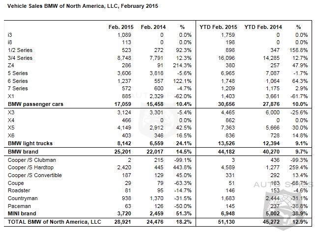 Sales of BMW brand vehicles increased 14.5 percent in February for a total of 25,201 compared to 22,017 vehicles sold in February, 2014. "In spite of ferocious cold and mountains of snow in so much of the country in February, our customers proved they could overcome and made it possible for BMW to post a new record for February sales," said Ludwig Willisch, President and CEO, BMW of North America. "Improved availability of the always popular X5 and the strong and growing interest in our 2 and 4 Series cars are good indicators of what's ahead."