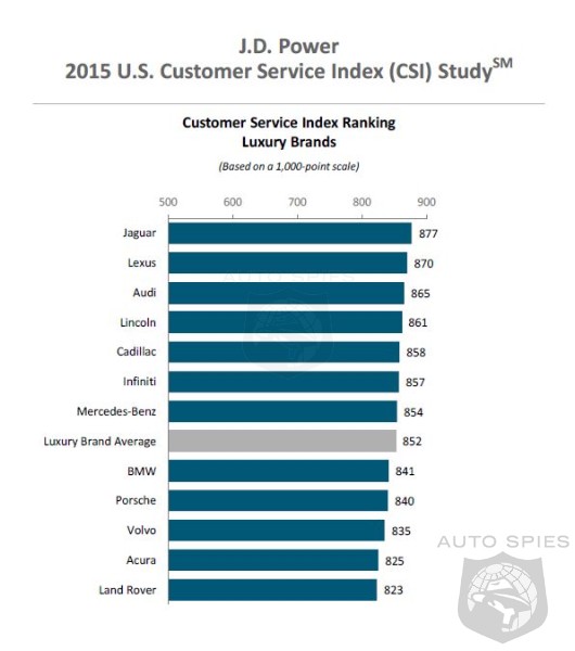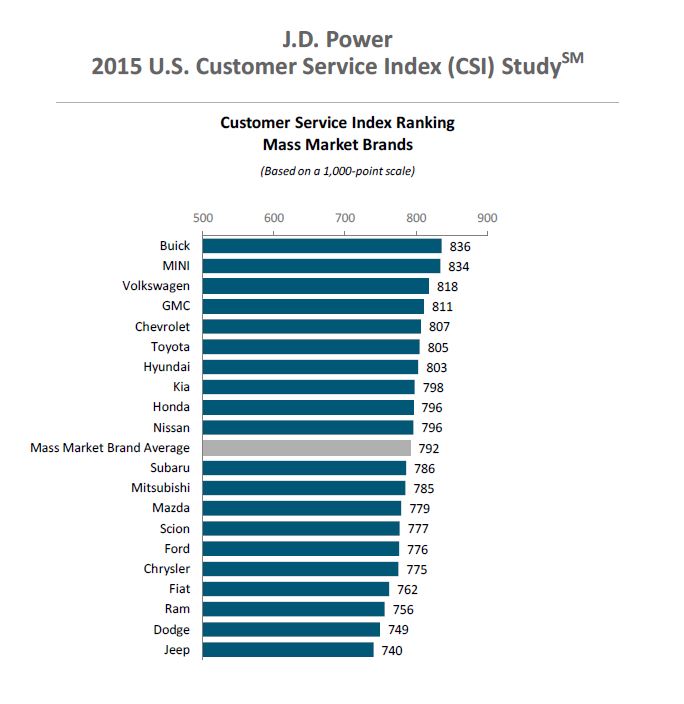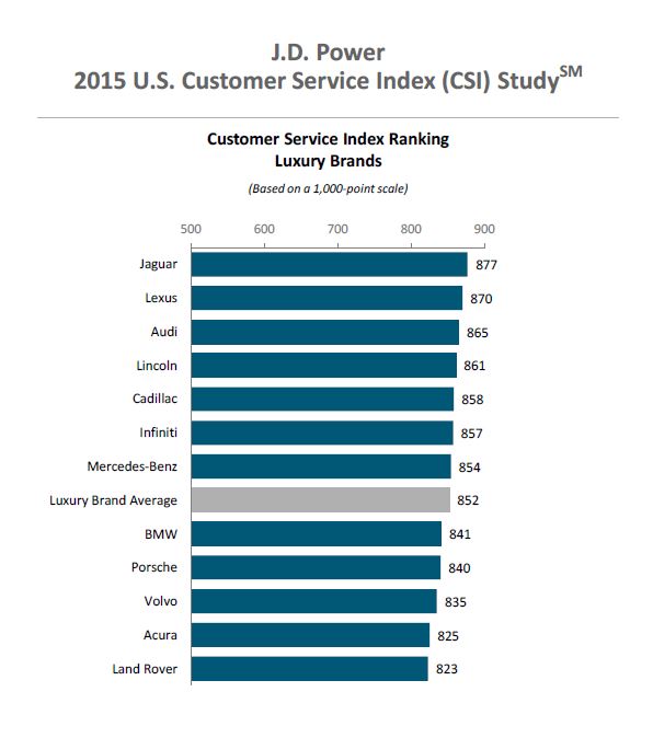 ranks highest in satisfaction with dealer service among luxury brands, with a score of 877. Following Jaguar in the luxury ranking are Lexus (870), Audi (865), Lincoln (861) and Cadillac (858). Buick ranks highest among mass market brands for a second consecutive year. Rounding out the top five mass market brands in the ranking are MINI (834), Volkswagen (818), GMC (811) and Chevrolet (807).