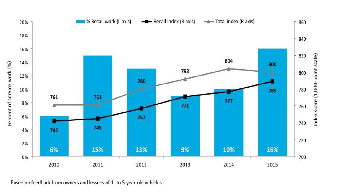 As the percentage of all dealer service visits related to automotive recalls reaches 16 percent—surpassing the recent peak of 15 percent in 2011—satisfaction among recall customers continues to improve, according to the J.D. Power 2015 U.S. Customer Service Index (CSI) StudySM released today. higher among customers with a recall visit than among those with a repair visit (781).