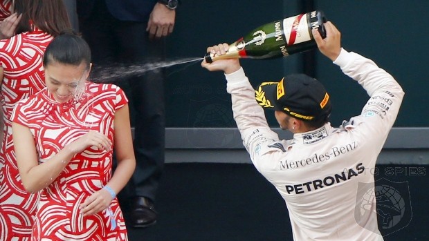 After his win, Hamilton celebrated by cracking open a bottle of champagne and spraying it around the podium. Some photos captured a race hostess being hosed in the face with champagne.