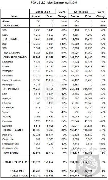 FCA US LLC today reported U.S. sales of 189,027 units, a 6 percent increase compared with sales in April 2014 (178,652 units), and the group's best April sales since 2007.