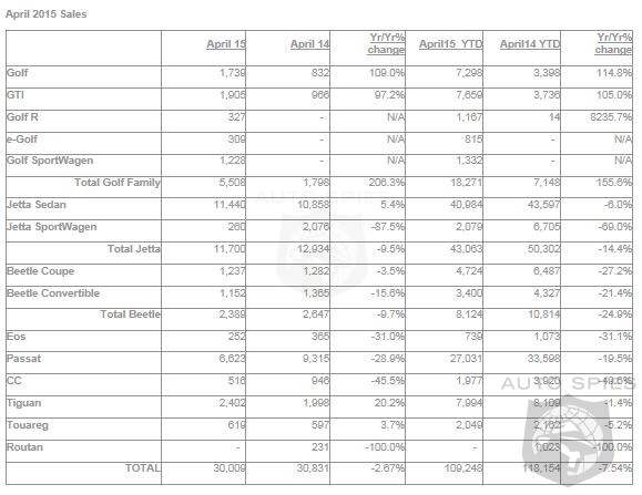 Volkswagen of America, Inc. (VWoA) today reported sales of 30,009 units delivered in April 2015.