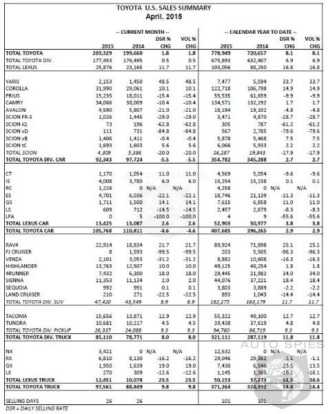 Toyota Motor Sales USA, Inc., today reported April 2015 sales of 203,329 units, an increase of 1.8 percent from April 2014 on a volume basis. With the same amount of selling days in April 2015 and April 2014, sales were up 1.8 percent on a daily selling rate (DSR) basis.