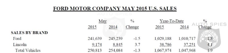 Ford Motor Company’s total U.S. sales of 250,813 vehicles for May declined 1 percent from a year ago. Retail sales of 171,535 vehicles decline 2 percent. Fleet sales of 79,278 vehicles are flat.