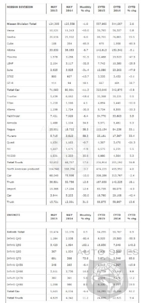 Nissan Group today announced total U.S. sales for May 2015 of 134,779 units.Nissan highlights: