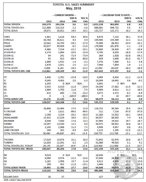 Toyota division posted May 2015 sales of 212,908 units, down 1.6 percent on a volume basis and up 2.2 percent on a DSR basis.
