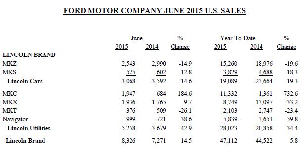 Lincoln retail sales increased 20 percent versus a year ago, providing the premium brand with its best June results since 2007. Lincoln MKC continues to build momentum, along with Navigator, which posted a 39 percent sales increase for June. All-new Lincoln MKX sales started late last month.