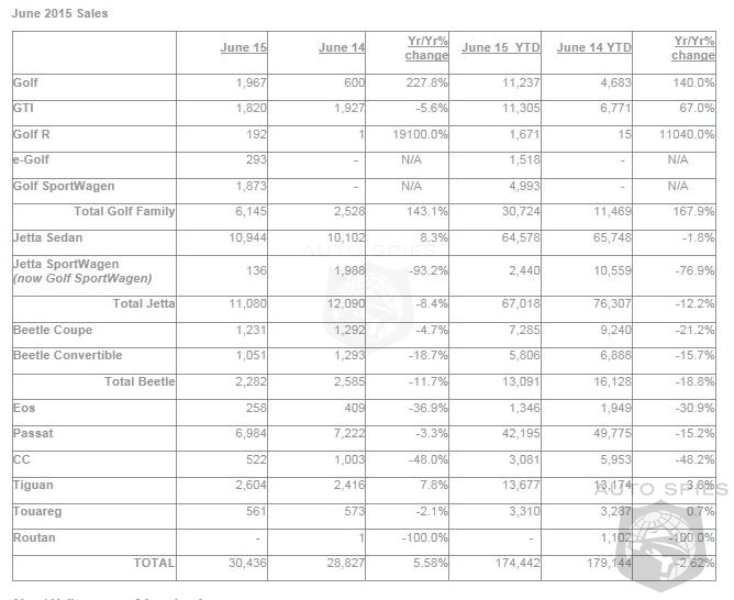 Volkswagen of America, Inc. (VWoA) today reported sales of 30,436 units delivered in June 2015.