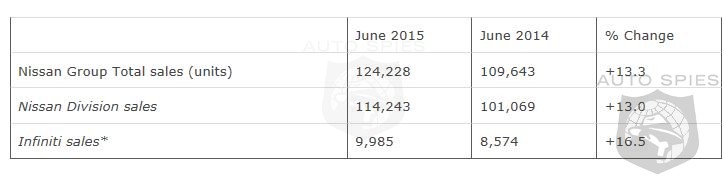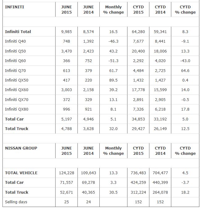 Nissan Group today announced total U.S. sales for June 2015 of 124,228 units, an increase of 13.3 percent and a June record.Nissan highlights: