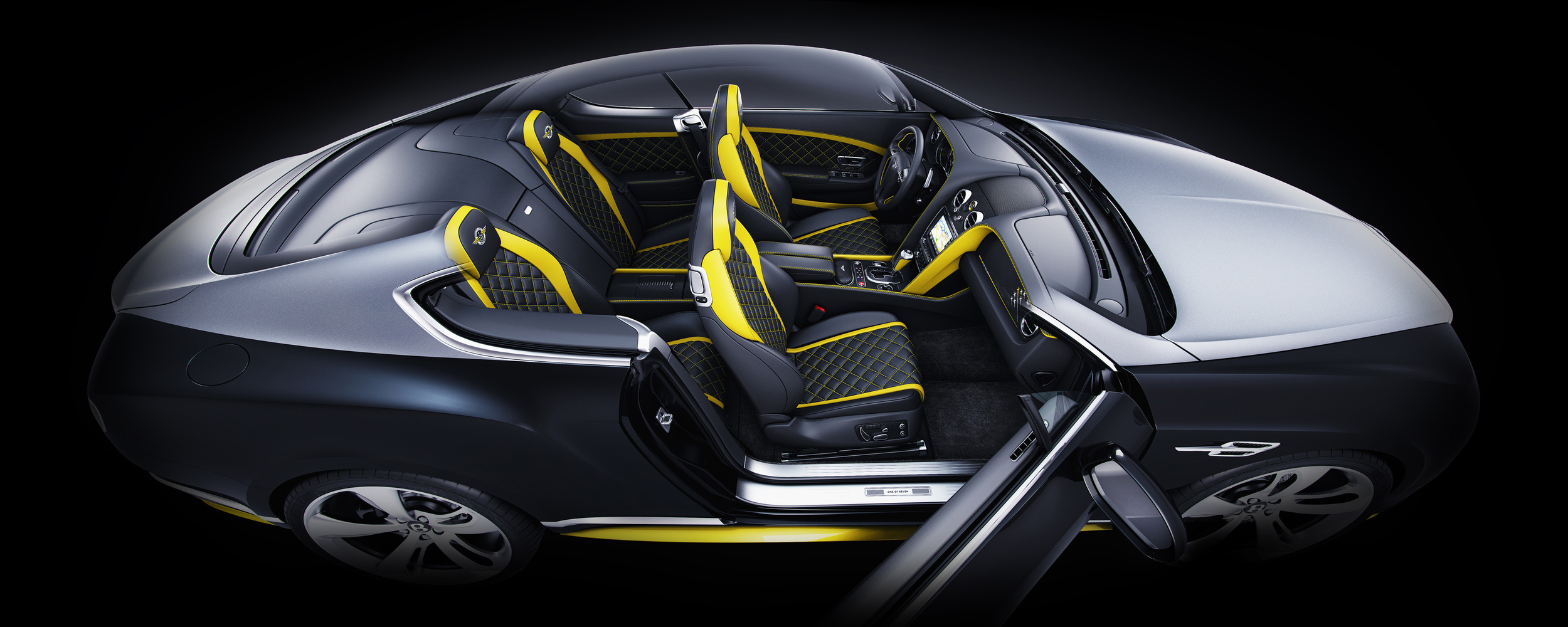 Taking customisation to new heights, each car is individually numbered and corresponds to one of the seven Breitling Jets. The dashboard's carbon fibre fascia panel displays an image of the seven planes in their signature Avenger flight formation, with the corresponding jet highlighted in Breitling Yellow.