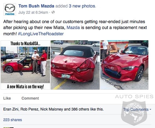 Interested in feeling a little better about the state of humanity in general? If so, put down those pills and booze and listen to this. Earlier this week, the very first, brand-new 2016 Mazda Miata met its end, by being rear-ended by an F-150 less than a mile from the dealer. Gutting, right? Well, incredibly, Mazda is going to make things right.