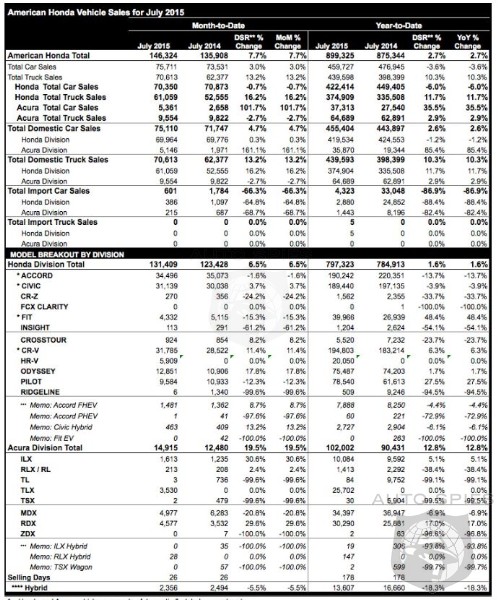 American Honda Motor Co., Inc. today reported an increase of 7.7 percent in July 2015, on sales of 146,324 Honda and Acura vehicles. Honda and Acura trucks led the July sales gain, combining for a 13.2 percent increase on sales of 70,613 vehicles. Honda Division sales rose 6.5 percent overall on sales of 131,409 units, while Acura reported a gain of 19.5 percent with 14,915 vehicles sold in July.