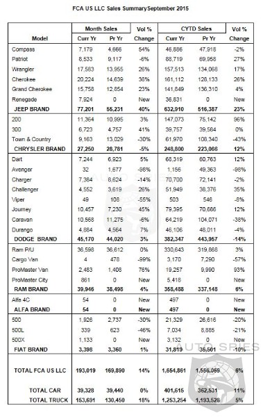 FCA US LLC today reported U.S. sales of 193,019 units last month, a 14 percent increase compared with sales in September 2014 (169,890 units), and the company's best September sales since 2000.