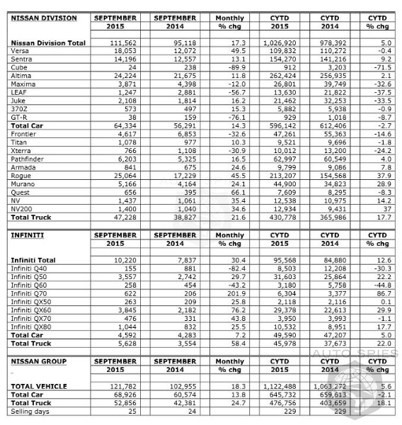NOTE: To ensure consistency in global sales reporting, Nissan North America calculates monthly variances on a straight-percentage basis, unadjusted for the number of selling days. September 2015 had 25 selling days, while September 2014 had 24 selling days.