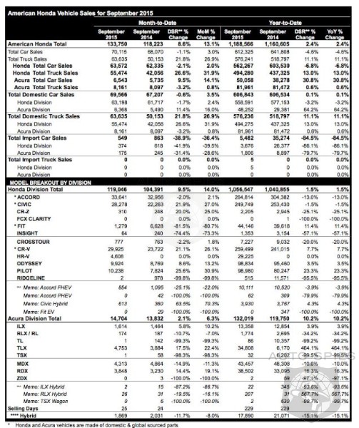 American Honda Motor Co., Inc. today reported a robust 13.1 percent September 2015 sales increase on total sales of 133,750 Honda and Acura vehicles for a new September benchmark. Honda Division sales totaled 119,046, up 14 percent for a new September record, with car sales reaching 63,572 for a 2 percent gain and truck sales rising 31.9 percent on sales of 55,474 for another September record. Acura reported 14,704 vehicle sales for a solid 6.3 percent gain, with cars capturing 6,543 sales (up 14.1 percent) and trucks setting a new September record, reaching 8,161 sales (up 0.8 percent).