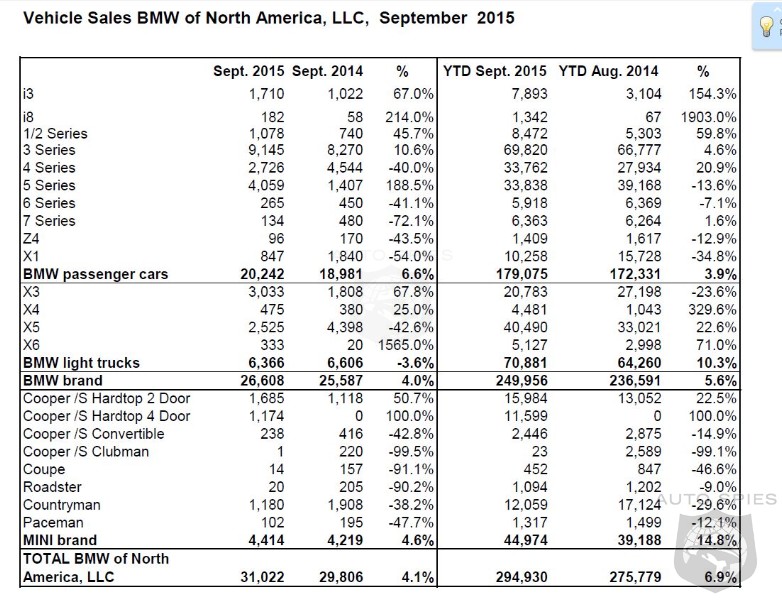 Sales of BMW brand vehicles increased 4.0 percent in September for a total of 26,608 compared to 25,587 vehicles sold in September, 2014. Year-to-date, BMW brand sales are 249,956 vehicles, a 5.6 percent increase from the same period last year.