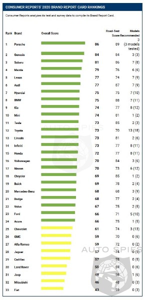 For the second year, Buick was the only domestic brand in the top 10 coming in seventh place. Cadillac dropped seven places to near the bottom, still plagued by its CUE infotainment system. Other General Motors brands, Chevrolet and GMCC finished in the bottom third of the overall rankings.