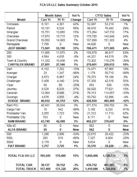 FCA US LLC today reported U.S. sales of 195,545 units last month, a 15 percent increase compared with sales in October 2014 (170,480 units), and the company's best October sales since 2001.