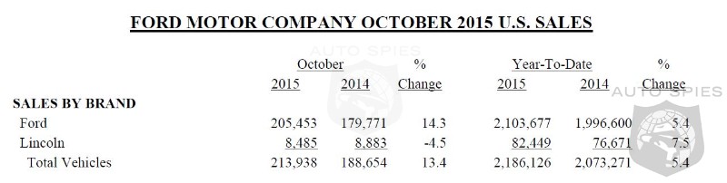 Ford Motor Company U.S. sales totaled 213,938 vehicles last month, up 13 percent from a year ago. Retail sales results were up 13 percent with 154,036 vehicles sold – for the company’s best October sales performance since 2004.Retail sales increased across the product portfolio, with cars up 8 percent, with both trucks and SUVs rising 15 percent.
