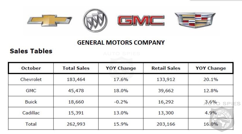 General Motors’ (NYSE: GM) Chevrolet, Buick, GMC and Cadillac brands sold 262,993 vehicles in the United States in October 2015, with Chevrolet posting its best October sales since 2004.GM’s total and retail deliveries – sales to individual customers – climbed 16 percent compared with a year ago, outpacing a very strong industry, and the company’s retail market share has now climbed for seven consecutive months versus 2014. Commercial deliveries in October were up year over year for the 24th consecutive monthly gain. Total fleet sales were up 16 percent.