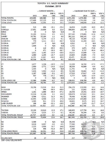 Toyota Motor Sales (TMS), U.S.A., Inc., today reported October 2015 sales of 204,045 units, an increase of 13 percent on a volume basis. With one more selling day in October 2015 than in October 2014, sales were up 9.0 percent on a daily selling rate (DSR) basis.