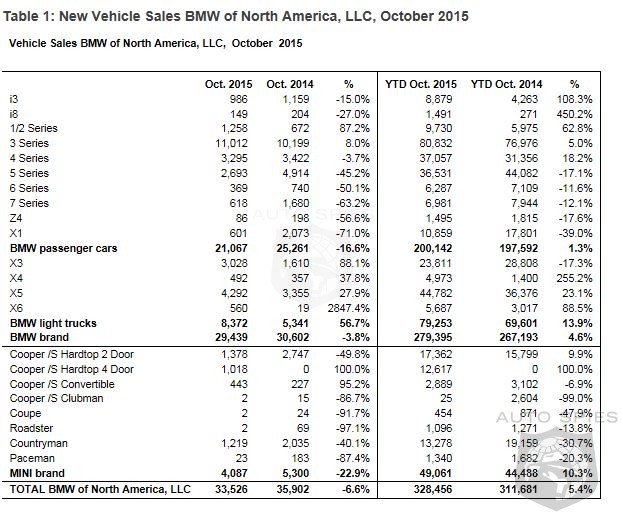 In total, the BMW Group in the U.S. (BMW and MINI combined) reported October sales of 33,526 vehicles, a decrease of 6.6 percent from the 35,902 vehicles sold in the same month a year ago. Year-to-date, BMW Group sales are up 5.4 percent from the same period last year with 328,456 vehicles sold.