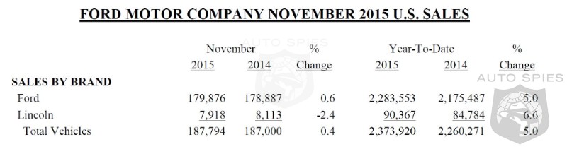 Ford Motor Company November U.S. sales totaled 187,794 vehicles, up slightly at 0.4 percent compared to a year ago.Through November, overall Ford sales are up 5 percent versus the same period a year ago.