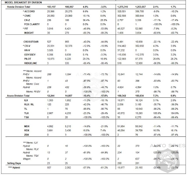 American Honda Motor Co., Inc. today reported November sales of 115,441 Honda and Acura vehicles, a decrease of 5.2 percent in a month with two fewer selling days and one less weekend vs. a record-setting November 2014. Honda Division sold 103,197 units, with car sales reaching 53,900 and truck sales totaling 49,297 for the month. Acura sales totaled 12,244, with sedan sales of 4,461 and trucks reaching 7,783 units in November. Honda