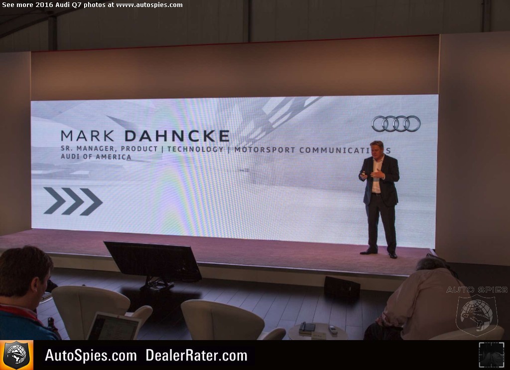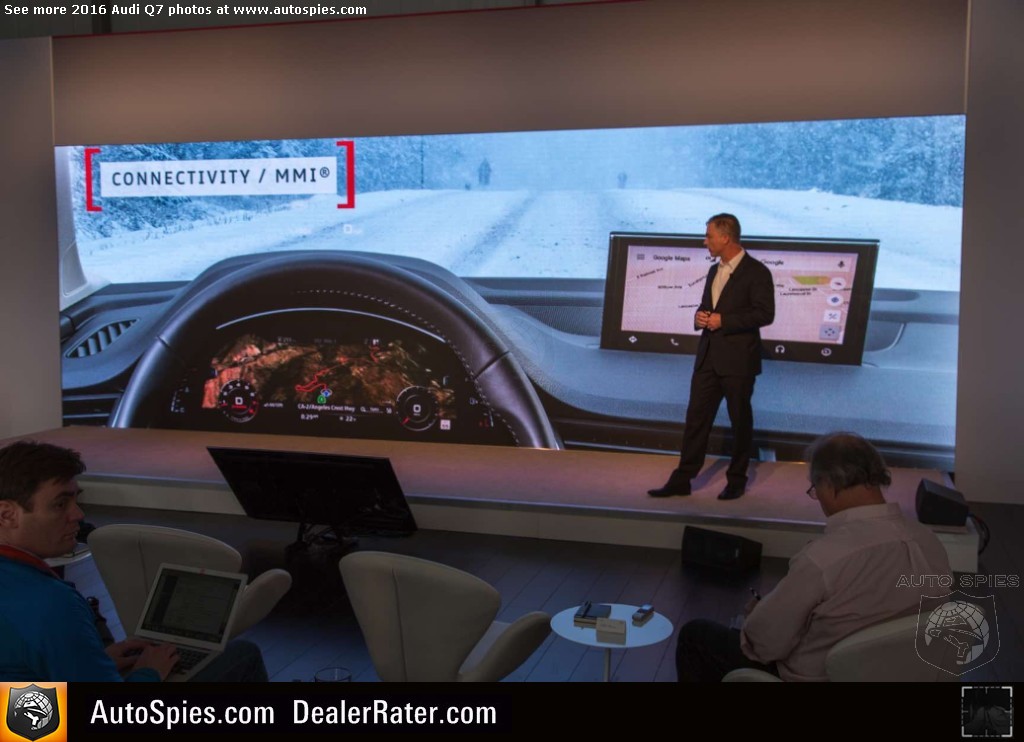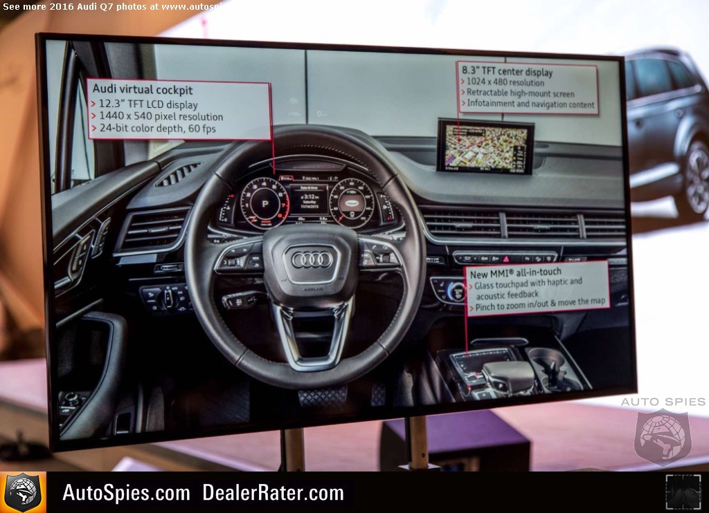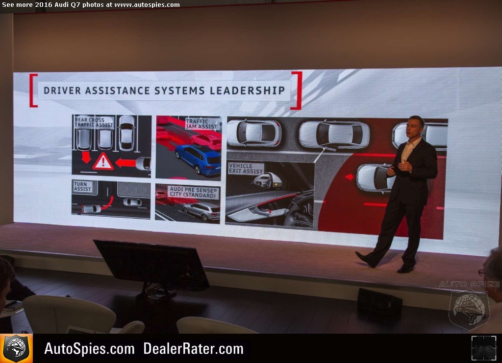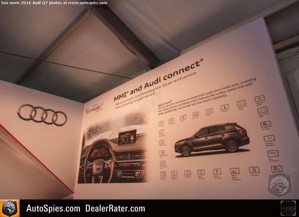 As noted in my previous thread, there's been incredibly strong interest in the all-new Audi Q7 sport-utility vehicle. Following up on a very successful first-gen product, the four rings certainly has its work cut out for itself. The goods news though is that it seems Audi is combating this with the best way it knows how. It's going to beat consumers over the head with technology. 2016 Audi Q7Though that may sound like a negative, it's actually a positive. That's because I am pretty sure that a lot of this tech that you'll see below is actually super helpful to the typical buyer of a product like a Q7. Will I need it? No. But perhaps the mother or father of four that has to be making trips to the grocery store, the mall and whatever else will. Check out just a sampling of Agent 001's photos coming to LIVE from Q7 product launch in northern California. 2016 Audi Q7