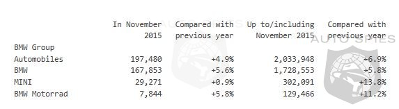 The BMW Group has achieved new record sales for November with a total of 197,480 (+4.9%) vehicles delivered to customers worldwide. This brings the total number of vehicles sold by the company so far in 2015 to 2,033,948 (+6.9%). It's the first time the company has sold over 2 million vehicles by this stage in the year.