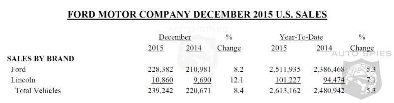 “December capped off six straight months of year-over-year sales gains for F-Series, with strong increases coming from both retail sales and the strength of commercial fleet orders, as we closed out 2015,” said Mark LaNeve, Ford vice president, U.S. Marketing, Sales and Service. “Ford-brand SUVs delivered their best sales results in more than a decade, with our newest SUVs leaving dealer lots in a matter of days.”