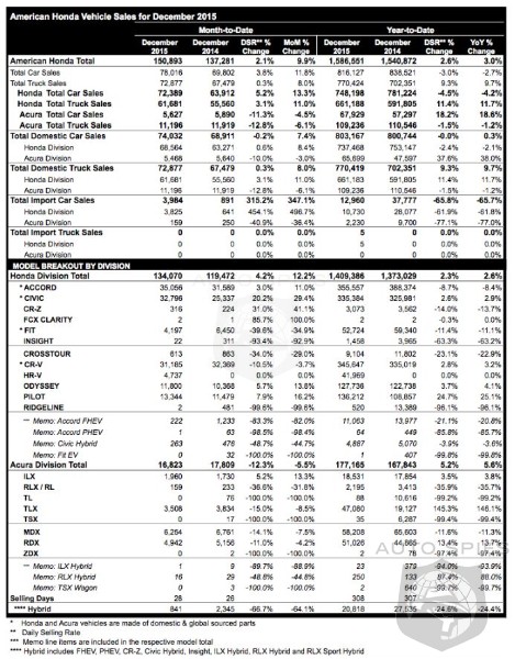 American Honda Motor Co., Inc. today reported all-time record annual sales of 1,586,551 Honda and Acura vehicles for 2015, an increase of 3.0 percent to beat the previous record set in 2007. Honda and Acura truck sales also set a new annual record, gaining 9.7 percent on sales of 770,424. Honda Division sales topped last year`s record to set a new annual mark, rising 2.6 percent on sales of 1,409,386 units. Acura sales totaled 177,165, a 5.6 percent increase for the year and the division's best result since 2007.