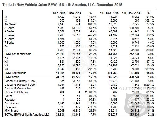 Sales of BMW brand vehicles in December totaled 34,625 compared to 41,526 vehicles sold in December 2014. For the year, BMW brand is up 1.8 percent on sales of 346,023 compared to 339,738 from last year, breaking last year's all time sales record.