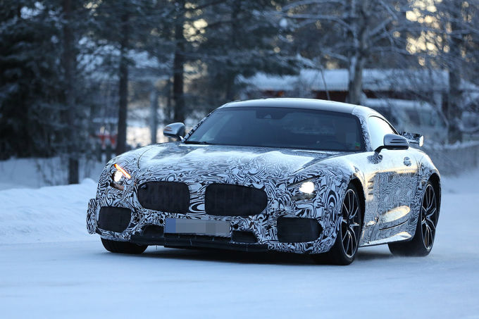 In these all-new spy shots of the GT-R undergoing winter testing, it's clearly a much more hardcore variant of the AMG GT. Some things to note. Check out its front grille lifted from the GT3 racer as well as that hardcore rear diffuser. That looks very, very serious. In addition, the fixed rear spoiler that's given away the test car still exists and we don't think that will change.