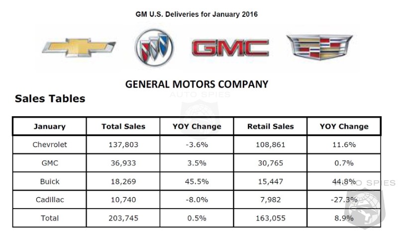 General Motors’ (NYSE: GM) Chevrolet, Buick, GMC and Cadillac dealers in the United States delivered 203,745 vehicles in January 2016, the company’s best January sales performance in eight years. GM’s retail sales were up sharply, climbing 9 percent year over year on the strength of a 12 percent increase at Chevrolet and a 45 percent increase at Buick. Total sales were up 0.5 percent.“GM began 2016 in very strong competitive position,” said Kurt McNeil, GM’s U.S. vice president of sales operations. “We built on that momentum in January, with Chevrolet, Buick and GMC outperforming the retail industry by a wide margin. In fact, Chevrolet continues to grow faster than any other full-line brand.”