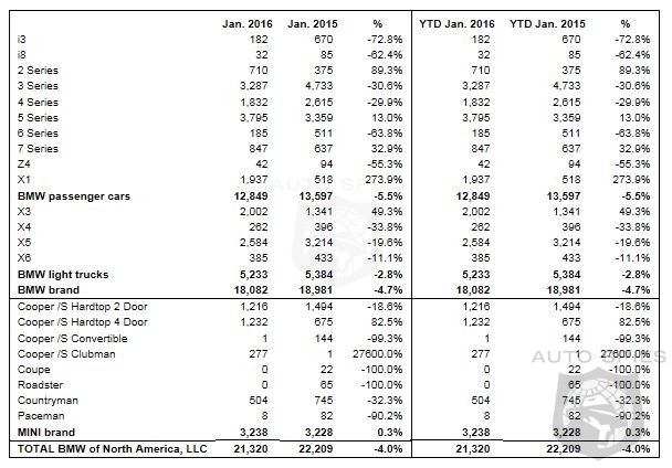 Sales of BMW brand vehicles decreased 4.7 percent in January for a total of 18,082 compared to 18,981 vehicles sold in January, 2015.