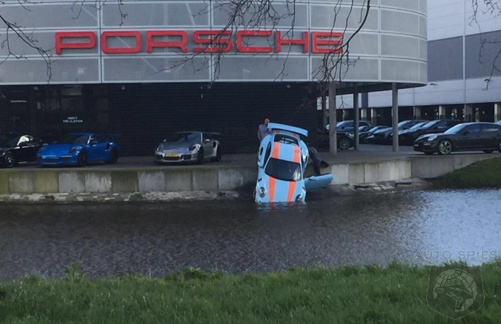 According to reports, a mechanic somehow took an all-new Porsche 911 GT3RS, specifically painted in Gulf colors, and put it into a canal in front of the dealership. We can only imagine that their foot slipped or something of the like. I mean, how else could you put the car that far off?