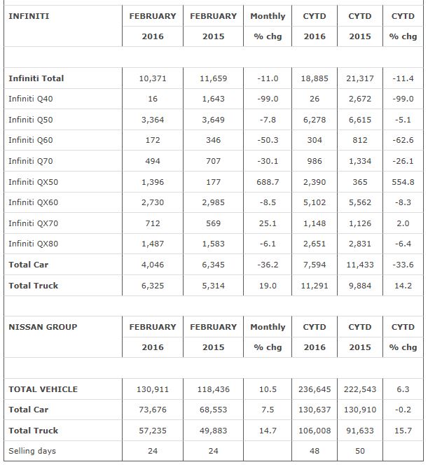 Nissan Group today announced total U.S. sales for February 2016 of 130,911 units, an increase of 11 percent over the prior year and a February record. | February 2016 | February 2015 | % Change |