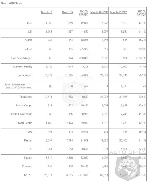 Volkswagen of America, Inc. (VWoA) today reported sales of 26,914 units delivered in March 2016. The Tiguan produced the best March results on record for the vehicle with 3,519 vehicles delivered, a 53 percent increase over March 2015. “We are pleased with the continued strong performance of the Tiguan,” said Mark McNabb, chief operating officer, Volkswagen of America. “While overall sales saw a decline for the month, Volkswagen dealers improved in terms of retail business.”