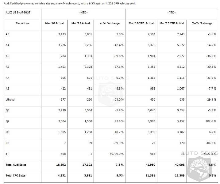 Audi Certified pre-owned vehicle sales set a new March record, with a 9.5% gain on 4,251 CPO vehicles sold.