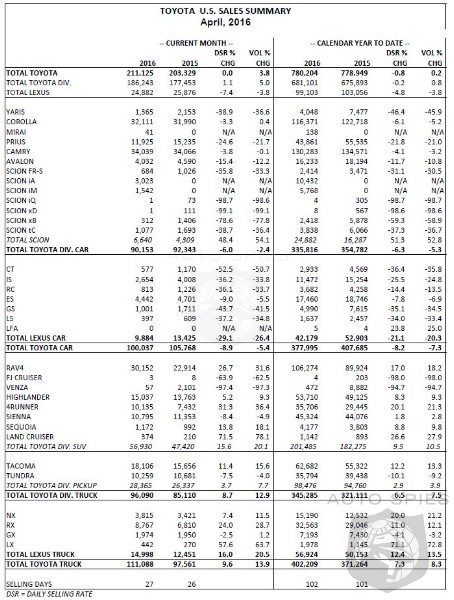 Toyota Motor Sales USA., Inc, today reported April 2016 sales of 211,125 units, an increase of 3.8 percent from April 2015 on a volume basis. With one more selling day in April 2016 compared to April 2015, sales were flat (zero percent) on a daily selling rate (DSR) basis.